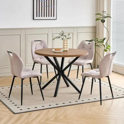 Ensemble Salle à Manger: Table Ronde 100cm et 4 Chaises Rembourrées Modernes, Foncé et Beige